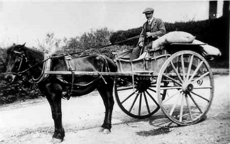 horse and trap with all the bread in baskets in the trap.