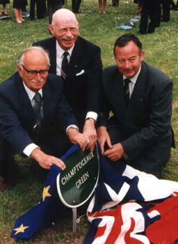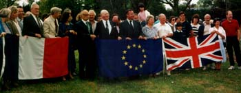 The formal ceremony was held in the Memorial Hall on the Saturday morning. With flags of all three nations fluttering on a beautiful sunny morning, a guard-of-honour at the entrance was provided by local Guides, Brownies, Scouts and Cubs. Members and guests found the Memorial Hall attractively decorated by the Verwood Flower Club, with four beautiful arrangements on the stage. The proceedings opened with a fanfare, written and played by Verwood Concert Brass, followed by the European Anthem. The Twinning Charters, which had been expertly prepared by a local lady, Mrs Helen Humber, were duly signed. Speeches were made by our MEP Mr Brian Cassidy, and the Mayor, Mr William Wells, and responded to by Burgermeister Gerhard Lehner and Champtoceaux Mayor and Deputy of France, Monsieur Alain Levoyer. As each speaker was introduced, the appropriate National Anthem was played by Verwood Concert Brass. A message from the Queen was read out, toasts were drunk in English wine (from Horton Vineyard) and the cake, made and decorated by Mrs Anita Cox, was cut and handed round. Shortly afterwards, the official guests departed for the Verwood Council Chambers, where they were entertained to lunch by the Mayor and Councillors. The evening entertainment was held in the Leisure Centre, where a formal dinner had been arranged. Presents were exchanged by the two towns - a specially-cast pottery model of an old Verwood thatched cottage to Liederbach, who had brought for us a Bundespost Telephone Box- They had also brought over a number of cases of local Rheingau wine, together with some glasses engraved with all their twin towns' crests. The evening's entertainment was enlivened by young Scottish dancers from Ferndown. Incidental music was provided by Courtlye Musicke, and, of course, by our own Verwood Concert Brass. A service was held in St Michael & All Angels Church on Sunday evening, and our guests departed the next day.