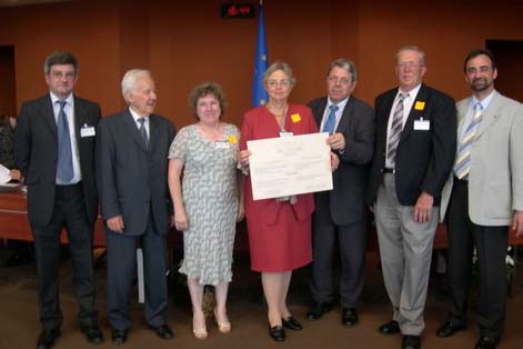 Unfortunately neither the Mayor nor any Verwood town councillor felt able to attend and so a small group of Twinning Committee members went to Strasbourg (see photo courtesy of H Green). The presentation was on the 22nd June 2005, at the "Palais de l'Europe", along with representatives of twinning towns from Austria, France, Germany, Hungary, Italy, Latvia, Poland, Romania, Serbia, Montenegro, UK and the Ukraine. The official handing over of the European Diploma took place in the Verwood Council Offices, to the Mayor, on the 24th of June 2005.