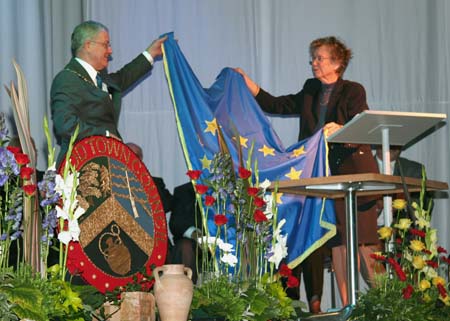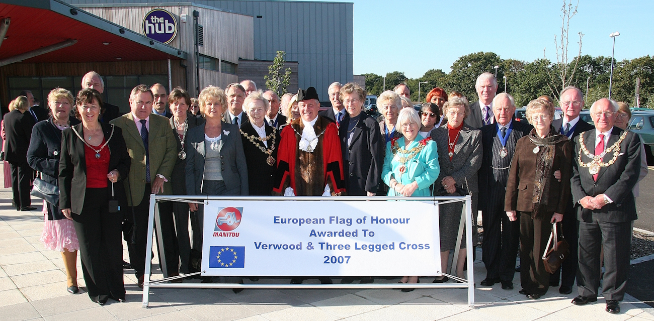 On the 52nd anniversary of the European flag, the Council of Europe congratulated the "Verwood & Three Legged Cross Twinning Association" by presenting it with the "European Flag of Honour" at a civic ceremony on Friday the 19th of October 2007 at "The HUB". The "European Flag of Honour" was presented to Mayor Alec Nichols by the Hon. Member of the Parliamentary Assembly of Europe Kerstin Eckman (see picture).  Verwood & 3LX was the only municipality in the UK and one of only 18 in Europe to receive it in 2007 and Rushmoor in Hampshire was the only UK town to be awarded the "European Diploma" which Verwood and 3LX was awarded in 2005. Nuremberg won the overall 2007 "Europe Prize".